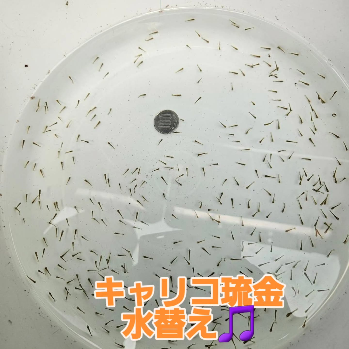 皆さん、こんにちは 月曜日産卵のキャリコ琉金の孵化が始まりました 少しでも沢山成長出来るように、大事に飼育していきたいと思います